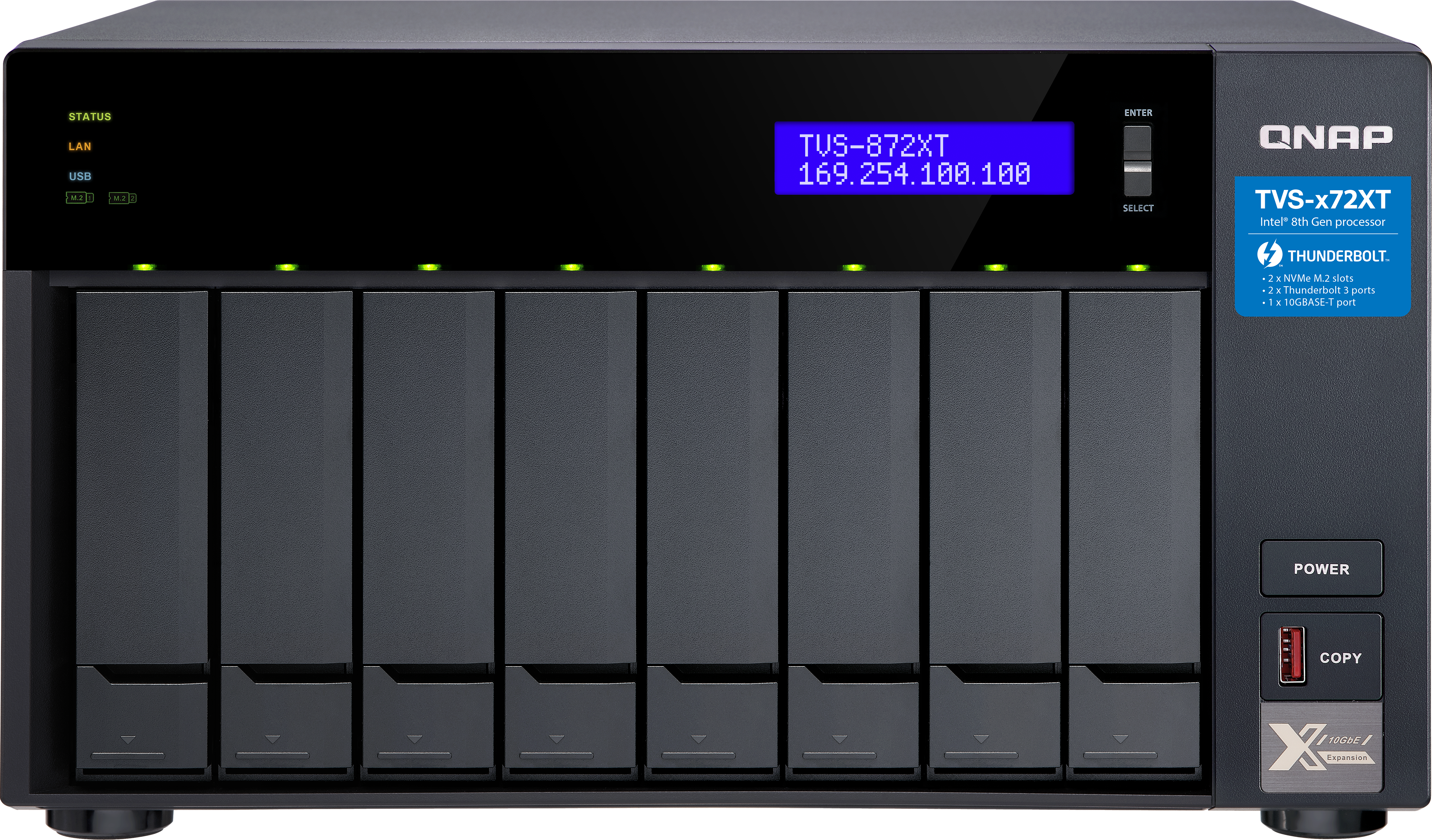 SMB QNAP TVS-872XT-i5-16G 8-Bay NAS, Intel Core i5-8400T 6-core 1.7 GHz (up to 3.3GHz), 16GB DDR4 RAM (max 32GB RAM), 8x 2.5"/3.5" SATA HDD/SSD + 2x M.2 PCIe SSD slot, 2xGbE LAN, 1 x 10GBase-T, 2 x Thunderbolt 3 port