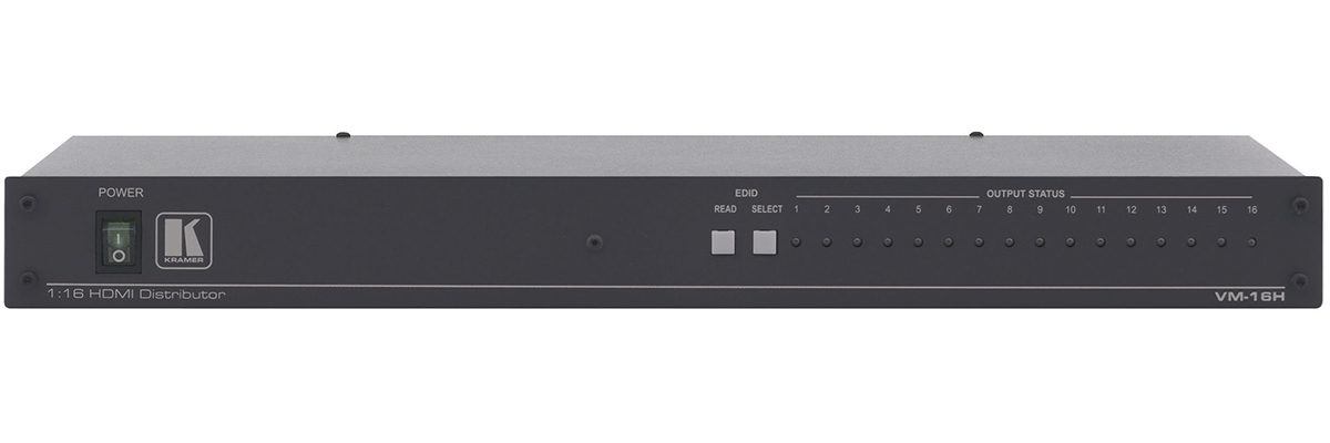 VM-16H – усилитель-распределитель 1:16 для сигналов HDMI. Он выполняет перетактирование сигнала и компенсацию АЧХ кабеля, после чего выдает сигнал на 16 одинаковых выходов.