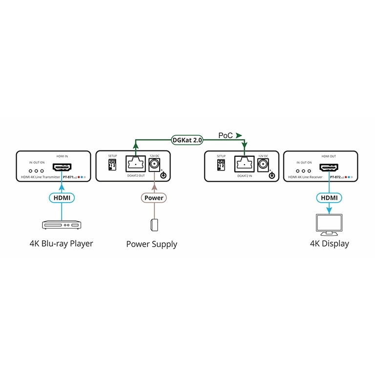 PT-871/2XR-KIT – комплект из передатчика и приемника сигналов HDMI 2.0 разрешением до 4K/60 (при субдискретизации 4:4:4), с поддержкой технологий HDR и HDCP 2.2 по витой паре DGKat 2.0. Оба прибора поддерживают подачу питания по витой паре – со стороны передатчика приемнику и наоборот. Дальность передачи сигналов 4K/60 при субдискретизации 4:4:4 достигает 60 м, увеличивается до 70 м для 4K/60 при 4:2:0. Высокопроизводительный удлинитель DGKat™ 2.0 для передачи на большие расстояния видеосигнала и двунаправленного питания по одному медному витопарному кабелю Использует современную технологию низкоуровневой компрессии без визуальной потери качества для передачи сигналов 4K/60 (4:4:4) HDR с почти нулевой задержкой PT-871XR конвертирует HDMI-сигнал в формат DGKat™ 2.0 и передает его на совместимый приемник PT-872XR, который совершает обратную конвертацию При использовании кабелей Kramer BC-UNIKat дальность передачи сигнала 4K/60 (4:4:4) достигает 60 м, для сигнала 4K/30 (4:4:4, 24 бита) расстояние увеличивается до 70 м Стандартная низкоуровневая компрессия автоматически применяется к сигналам разрешением выше 1080p. Пользователь может включить высокую компрессию для всех сигналов Максимальное разрешение при высокой компрессии — 3840×2160, 60 Гц (4:4:4), при стандартной — 4096×2160, 60 Гц (4:4:4) Удлинение сигнала HDMI. Поддержка HDMI 2.0 и HDCP 1.4, Deep Color, x.v.Color™, Lip Sync, 7.1 PCM, Dolby TrueHD, DTS-HD, 2K, 4K и 3D, HDR10 Алгоритм сквозной передачи EDID-данных гарантирует работу с HDMI-источниками и дисплеями в режиме Plug&Play Передача до 32 каналов несжатого цифрового стереоаудиосигнала Светодиоды указывают на наличие или отсутствие сигнала в определенных портах, что позволяет легко отслеживать и устранять возможные проблемы Монтаж не составит труда — блоки соединяются между собой стандартным кабелем витой пары для передачи сигналов и питания, ультракомпактные корпуса PicoTOOLS не имеют вентиляторов и подходят для крепления на тыловую сторону дисплея. Опциональный рэковый адаптер RK-4PT вмещает 4 прибора в таком форм-факторе (1U) Сертификация RoHS, WEEE, CE и UL