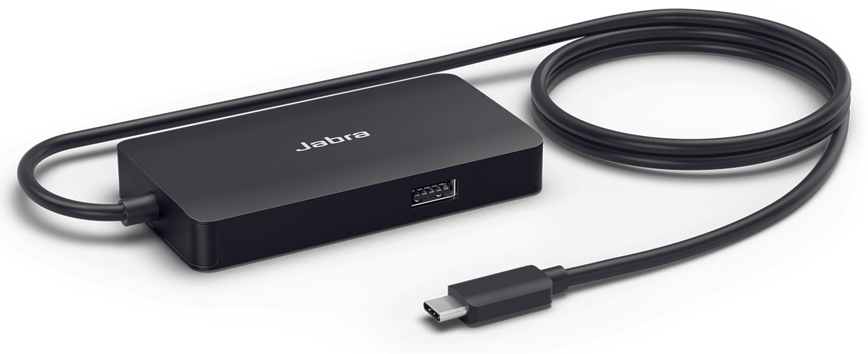Центральный блок, соединяющий Jabra PanaCast и Jabra Speak с компьютером с помощью одного кабеля.