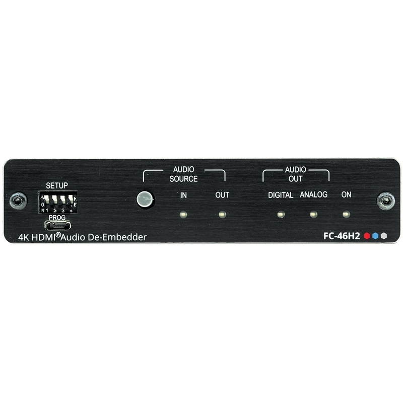 FC-46H2 – устройство для извлечения аудиосигнала из цифрового сигнала HDMI (деэмбеддер). Прибор выделяет аудиосигнал из входного сигнала HDMI разрешением до 4K/60 (4:4:4) с HDR. Полоса пропускания 600 МГц. Сигнал выдается одновременно на выходы S/PDIF и стереоаудио. Поддерживает HDMI-сигналы до 4K/60 Гц (4:4:4) с HDR (до 18 Гбит/с) Соответствие HDCP 1.4, 2.2 Извлекает аудиосигнал из входного сигнала HDMI или обратного аудиоканала ARC HDMI Выделенное аудио подается одновременно на цифровой выход S/PDIF и аналоговый балансный стереовыход Три режима работы с EDID-данными: сквозная передача или принудительный перевод аудио в режим LPCM 2.0 Замыкаемые контакты для дистанционного мьютирования Технологии Kramer Equalization & re-Klocking™ восстанавливают сигнал при передаче по длинным линиям Компактный корпус DigTOOLS® без вентиляторов Комплектуется скобой для монтажа к плоским поверхностям Монтируется в стойку при помощи опционального адаптера, в слот 1U помещается до трех FC-46H2