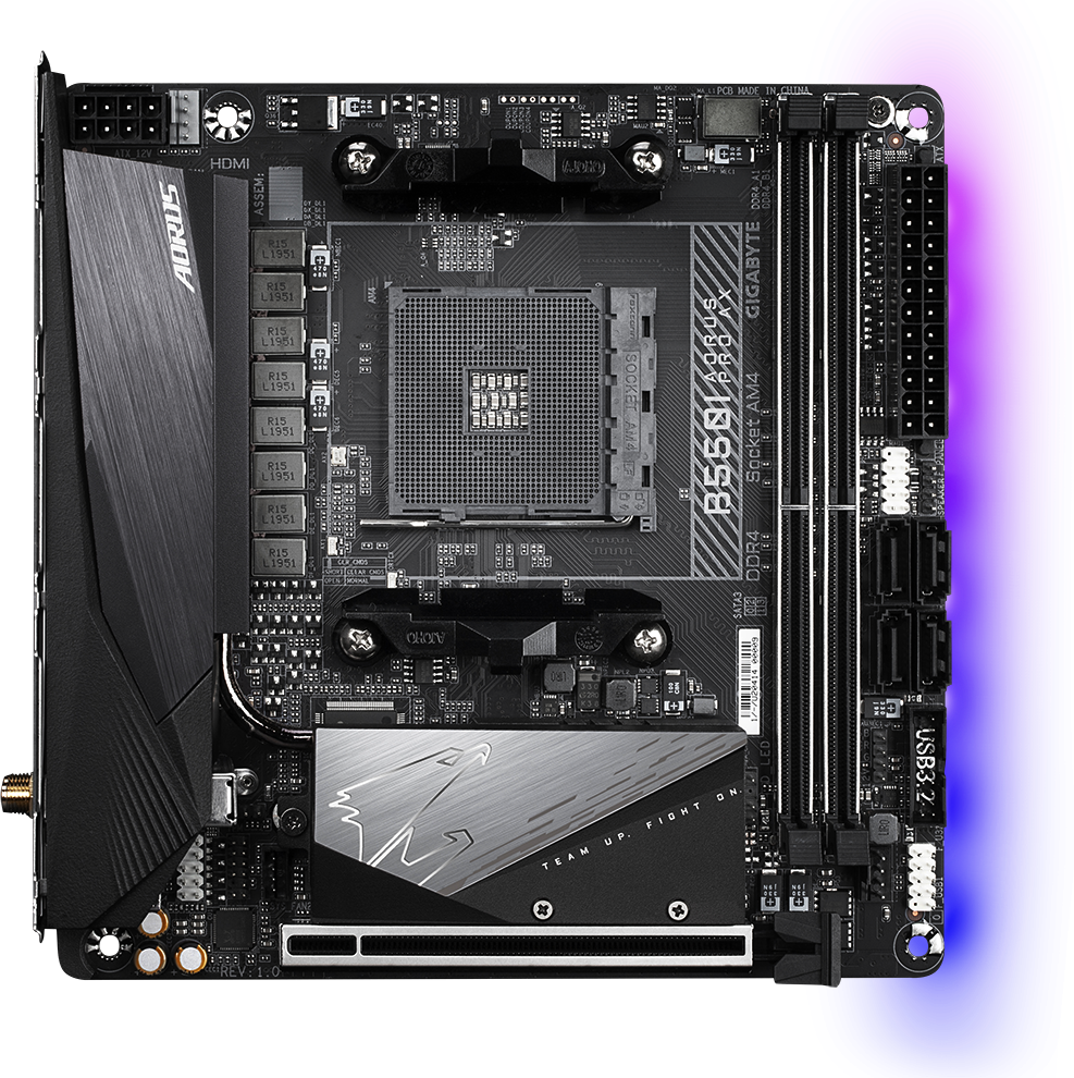 Материнская плата семейства AORUS форм-фактора Mini-ITX на базе чипсета AMD B550, 8-фазный цифровой VRM-модуль, оригинальная система охлаждения VRM-зоны и фирменные радиаторы, защитная термопластина на тыльной стороне платы, два разъема M.2 PCIe 4.0/3.0 и радиаторы Thermal Guard, модуль Intel® WiFi 6 802.11ax, контроллер 2.5GbE LAN, функция RGB FUSION 2.0, функция Q-Flash Plus