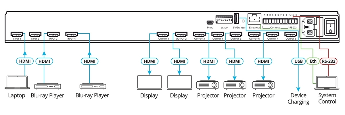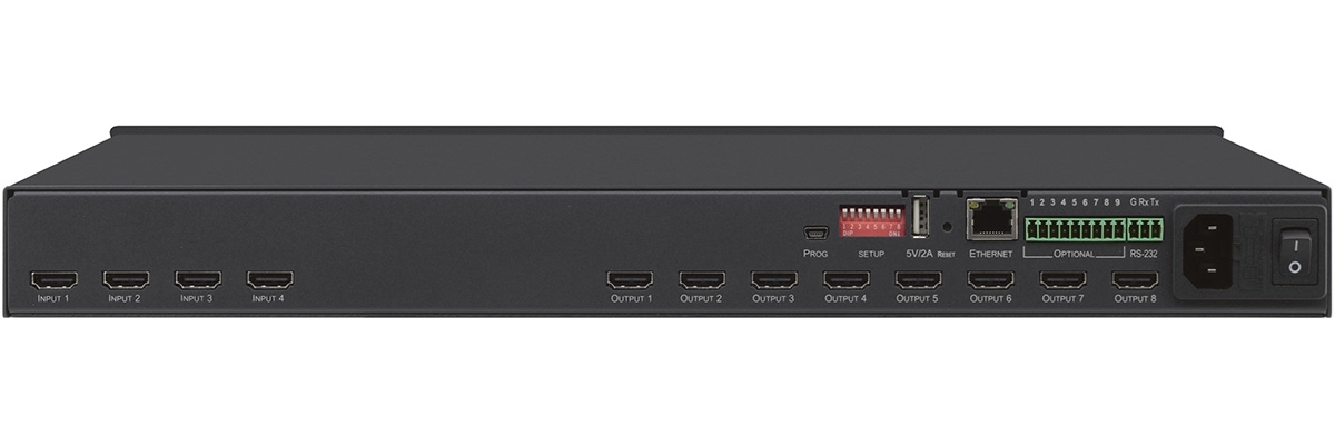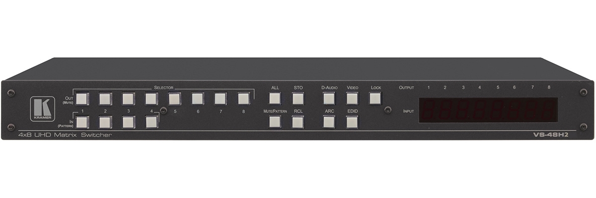 VS-48H2 – матричный коммутатор 4x8 сигналов HDMI с HDCP 2.2, EDID, 3D и ARC и Step-In. Поддерживает разрешения до 4K/60 (4:4:4). Позволяет подключить любой из входов к любому выходу или к любому набору выходов. Аудиоматрица устройства имеет размерность 12x12 (4 эмбеддированных аудио + 8 ARC + 8 цифровых выходов + 4 ARC) и коммутирует независимо от видео. Автоматическая коммутация, управление приоритетом, 16 пресетов. Устройство выполняет компенсацию АЧХ кабеля и перетактирование сигнала, восстанавливая его при передаче по длинным линиям с помощью технологии Kramer Equalization & re-Klocking™. Управляется по IP (web-интерфейс) и RS-232. Автоматическое переключение источника сигнала в зависимости от установленного приоритета или на последний подключенный источник Деэмбеддирование и коммутация вложенного цифрового аудио на входе в любой цифровой выход Соответствие HDCP 1.4 и 2.2 Поддержка HDMI 2.0 Поддержка Deep Color, 3D-видеоконтента, ARC, до 7.1 каналов вложенного несжатого цифрового аудио Управлением EDID на каждом входе Запись и сохранение EDID-данных подключенных дисплеев Индивидуальная настройка HDCP для каждого входа Сохранение до 8 пресетов Программа автоматизации помещения Kramer Maestro с интуитивным интерфейсом Встроенный генератор тестовых сигналов Удаленное управление по Ethernet, RS-232 и с помощью команд Kramer Protocol 3000 API Индикаторы выбранного входа упрощают процедуру поиска ошибок Обновление ПО через по Ethernet Легко устанавливается в рэковую стойку и занимает всего 1U ее внутреннего пространства Универсальный блок питания