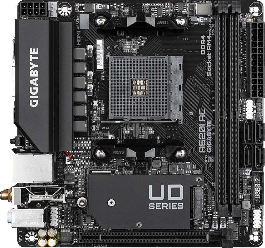 Материнская плата AORUS форм-фактора Mini-ITX на базе чипсета AMD A520, цифровой VRM-модуль и 6 целевых фаз питания, встроенный WiFi-модуль Intel® 802.11ac, контроллер Gaming GbE LAN и функция управления трафиком, M.2-разъем PCIe 3.0 x4, функции Smart Fan 5 и FAN STOP, функция RGB FUSION 2.0, функция Q-Flash Plus