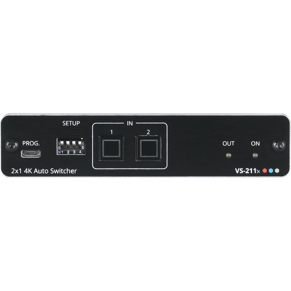VS-211X - коммутатор 2х1 HDMI c автоматическим переключением входов по наличию сигнала с поддержкой разрешений до 4K@60 Гц (4:4:4) и технологии HDR. Выбор одного из двух режимов автоматического переключения: на вход с приоритетом, или на вход с последним по времени подключения активным источником сигнала. ВНИМАНИЕ! Для гарантированного получения необходимых результатов (воспроизведения видео с нужным разрешением, правильными пропорциями изображения, корректной передачей цвета и т.д.) ОБЯЗАТЕЛЬНО выполните процедуру считывания EDID (см. соответствующий раздел Руководства по эксплуатации прибора). Удобная коммутация входов в ручном режиме - кнопками на лицевой панели или при помощи замыкания сухих контактов внешним устройством (например, при помощи нажимной кнопки). Технология Kramer-EDIDPro с интеллектуальным алгоритмом работы с EDID, предусматривающим сохранение блока данных EDID во встроенной памяти прибора или сквозной пропуск данных EDID от дисплея к источнику сигнала, для упрощения процесса соединения HDMI устройств (технология Plug and Play). Поддержка до 32 каналов цифрового несжатого стерео аудиосигнала для работы с системами объёмного звучания студийного уровня. Поддержка HDCP 2.3, а также режимов deep color, x.v.Color, 3D, CEC, lip sync, каналов несжатого цифрового аудио , Dolby TrueHD, DTS-HD в соответствии со спецификацией HDMI 2.0. Автоматическое деэмбедирование аудио из сигнала HDMI на выходе коммутатора: аудиосигнал преобразуется в аналоговый формат и поступает на небалансный стерео аудиовыход прибора, параллельно с этим аудио воспроизводится внешними или встроенными громкоговорителями потребителя сигнала HDMI (например ТВ-приемника со встроенной акустической системой). Автоматическое конфигурирование устройства по технологии Plug and Play. Автоматическое подключение к дисплею источника сигнала в соответствии с установленным пользователем режимом переключения: на вход с приоритетом или вход с последним по времени подключения активным источником сигнала. Ручное переключение входов имеет приоритет над любым выбранным сценарием автоматической коммутации. Светодиодная подсветка кнопок выбранного входа, а также светодиодные индикаторы питания и наличия сигнала на выходе для удобства эксплуатации, обслуживания и диагностики. Наличие местного входа micro USB для обновления встроенного ПО, облегчающего длительную эксплуатацию устройства, установленного на объекте. Простота инсталляции: Компактный корпус Kramer DigiTOOLS, отсутствие вентилятора охлаждения и низкое тепловыделение позволяют разместить три прибора рядом в стандартной аппаратурной 19-дюймовой стойке (1U) с помощью опционального адаптера RK-3T-B.
