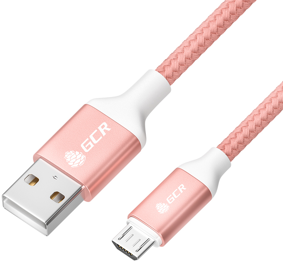 GCR QC Кабель 0.5m MicroUSB, быстрая зарядка, розовый нейлон, AL корпус розовый, белый ПВХ, 28/24 AWG, GCR-52464