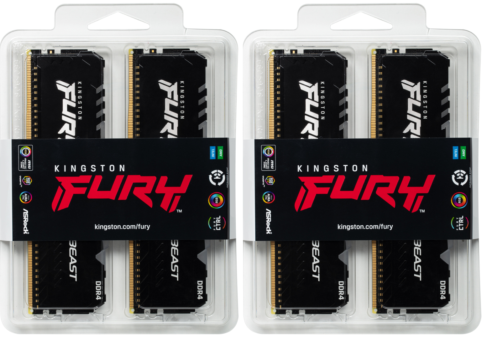 Модуль памяти Kingston FURY™ Beast DDR4 RGB помогает выразить свой стиль и обеспечивает повышение производительности благодаря частоте до 3733 МГц, агрессивному дизайну и RGB-подсветке по всей длине модуля, которая обеспечивает плавные, потрясающие световые эффекты. Этот великолепный и экономный вариант модернизации имеет рабочие частоты 2666 - 3733 МГц, значения латентности CL15 - 19, а также емкость одиночных модулей 8 - 32 ГБ и комплектов 16 - 128 ГБ. Он отличается самонастраивающейся возможностью автоматического разгона памяти Plug N Play на частотах 2666 МГц и совместимы и с профилями Intel® XMP и с профилями AMD Ryzen™. Настройте эффекты RGB-подсветки с помощью программного обеспечения FURY CTRL компании Kingston и ее запатентованной технологии Infrared Sync Technology. Модули FURY Beast DDR4 RGB не нагреваются за счет использования стильного низкопрофильного теплоотвода. Эти модули, прошедшие полную проверку на рабочей частоте и обеспечиваемые гарантией на весь срок службы, станут легким, удобным обновлением вашей системы на основе процессоров Intel или AMD.