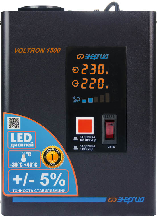 Серия Voltron – универсальные стабилизаторы напряжения для любой техники в доме. Надёжные (усиленные вольфрамовые контакты реле), неприхотливые (могут быть установлены в неотапливаемых помещениях), обеспечивают высокую точность стабилизации (5%) с высокой скоростью срабатывания при резких перепадах напряжения.Стабилизаторы отличаются широким диапазоном входного напряжения – от 80 до 280 вольт, что позволяет получать стабильное напряжение даже в самых проблемных электросетях.Термодатчик, встроенный в обмотку трансформатора, повышает защиту от перегрева.Благодаря отсутствию в конструкции стабилизаторов подвижных элементов, их можно эксплуатировать в условиях низких температур.Универсальный способ крепления позволяет устанавливать стабилизаторы как на горизонтальную поверхность, так и повесить на стену.