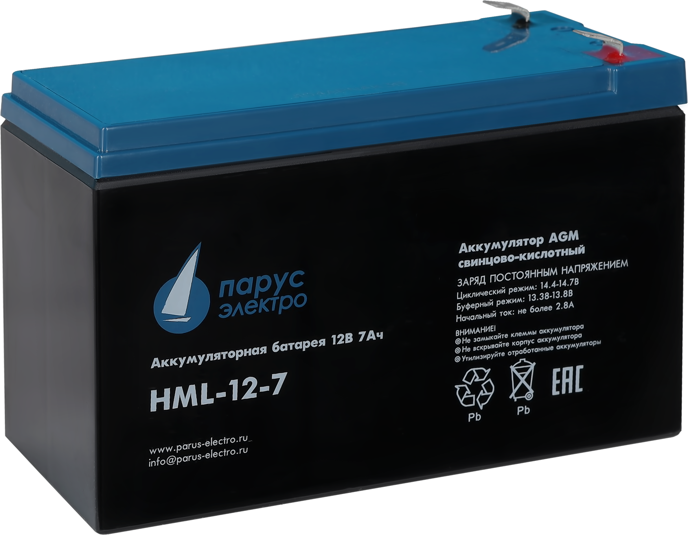 Батарея Парус Электро, профессиональная серия HML-12-7, напряжение 12В, емкость 7.2Ач (разряд 20 часов), макс. ток разряда (5сек) 140А, макс. ток заряда 2.8А, свинцово-кислотная типа AGM, клеммы F2, ДхШхВ 151х65х94мм., полная высота с клеммами 101мм., вес