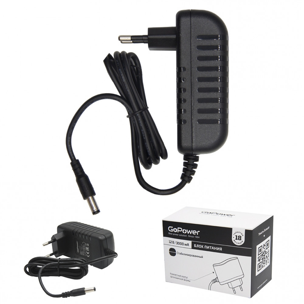 Блок питания GoPower 3.0A 12V 5,5x2,5/12мм импульсный (1/90)