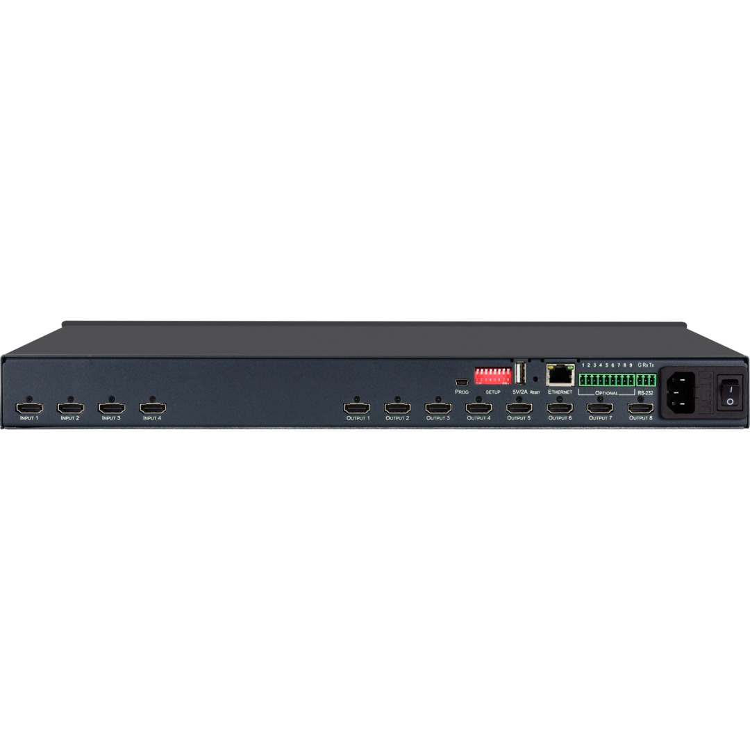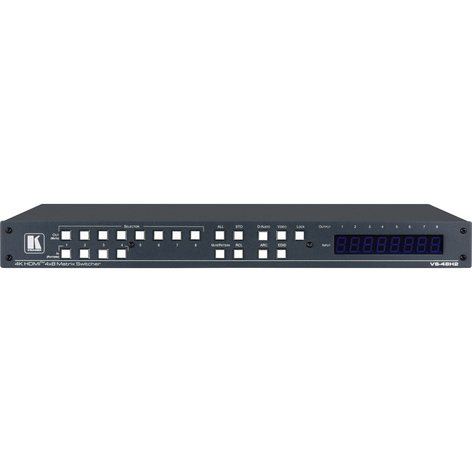 S-48H2 – матричный коммутатор 4х8 сигналов HDMI c поддержкой разрешений до 4K@60 Гц (4:4:4) и технологии HDR, а также с функцией независимого переключения цифровых аудиосигналов. Прибор осуществляет перетактирование входного сигнала, компенсацию АЧХ кабеля и переключение сигнала HDMI от любого из четырёх источников сигнала, поддерживающих HDCP-кодирование, на любой из восьми выходов или на любые комбинации выходов. VS-48H2 обладает непревзойденной гибкостью коммутации аудиосигналов, позволяя переключать любой эмбедированный цифровой аудиосигнал на любой цифровой выход в дополнение к восьми источникам обратного аудиоканала (ARC), что эквивалентно аудиоматрице размерностью 12x10. Максимальная скорость передачи данных: 18 Гбит/с (6 Гбит/с на один канал) Максимальное разрешение: 4K@60 Гц (4:4:4) Поддержка технологии HDR Соответствие требованиям HDMI 2.0/1.4 — поддержка Deep Color, 3D, ARC, некомпрессированного многоканального аудио до 7.1 Независимая коммутация аудио – любой эмбедированный цифровой аудиосигнал может переключаться на любой цифровой выход в дополнение к восьми источникам обратного аудиоканала (ARC), что эквивалентно аудиоматрице размерностью 12x10 (4 входа HDM с эмбедированным аудио + 8 обратных аудиоканалов ARC на входе + 8 выходов HDMI + 2 выхода ARC) Удаленный выбор входа с помощью совместимых устройств Step-in Использование технологии Kramer Equalization & re-Klocking для компенсации АЧХ кабеля и перетактирования — восстанавливает сигнал при передаче по длинным линиям Cохранение (и быстрый вызов) до 16 пресетов конфигураций матрицы в энергонезависимой памяти Автоматическое переключение на вход с наивысшим приоритетом, или на вход с последним по времени подключения источником сигнала Встроенный генератор испытательных сигналов Индивидуальная работа с блоком данных EDID на каждом входе Независимая установка режима поддержки HDCP на каждом входе Удобство и разнообразие способов управления — ручное: кнопки переключения входов/выходов на лицевой панели, кнопки блокировки лицевой панели и считывания EDID, кнопки сохранения/вызова пресетов. Удаленное управление по Ethernet с помощью интуитивно-понятных встроенных веб-страниц, с помощью команд RS-232, а также команд API протокола Kramer Protocol 3000, передаваемых посредством ПК, сенсорной панели управления или иного контроллера Удобство обслуживания — наличие индикаторов выбранных входов/выходов, обновление встроенного ПО с помощью локального порта mini-USB Простота установки: стандартный корпус, предполагающий размещение прибора в стандартной 19-дюймовой стойке 1U при помощи входящих в комплект монтажных уголков. Встроенный универсальный блок питания 100-240 В переменного тока.