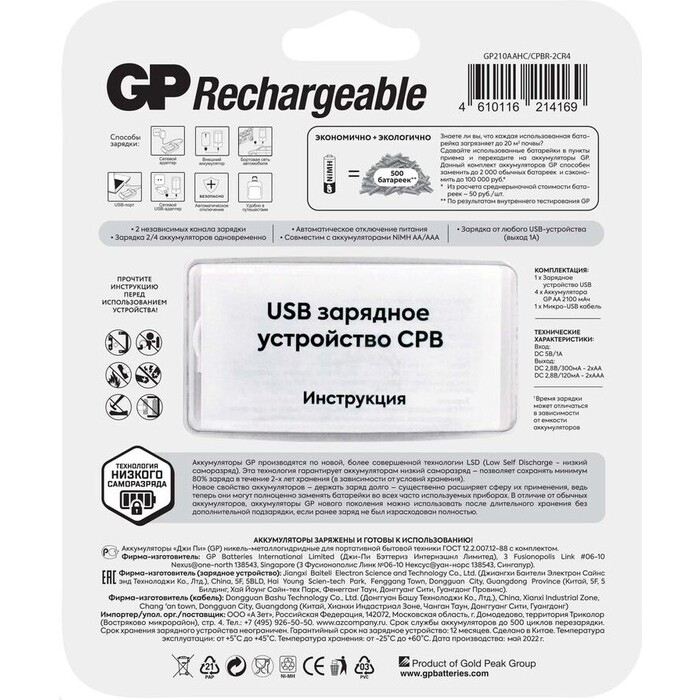 Аккумуляторы GP неизменно побеждают обычные батарейки - особенно там, где требуются компактные элементы питания большой емкости. На работе, в путешествиях, на отдыхе у Вас всегда под рукой комплект надежных источников питания с зарядным устройством. Долговечность. Аккумуляторы GP, рассчитанные на 500 зарядок - выгодная покупка. Вы надолго забудете о расходах на новые источники питания. Использование аккумуляторов - ощутимый вклад в экономию семейного бюджета в сравнении с тратами на одноразовые элементы питания. Аккумуляторы сохраняют свой заряд, даже если Вы их не используете. Технология низкого саморазряда позволяет использовать элементы питания, когда это требуется. Нет необходимости ждать полного разряда аккумуляторов - подзаряжать их можно в любое время. Элементы питания GP уверенно работают в температурах от -20 до +50°C. Аккумуляторы дополнены универсальным ЗУ, поддерживающим зарядку батарей класса ААА и АА. В комплекте поставляется кабель microUSB, через который производится зарядка. Адаптер для сети 220В в комплектации отсутствует. Безопасность Аккумуляторы будут эффективно работать на протяжении всего срока службы, если соблюдать правила использования элементов питания. Не рекомендуется разбирать или нагревать устройства. Категорически запрещается заряжать элементы питания разного размера или емкости. Не допускайте падания батареек в руки маленьких детей!