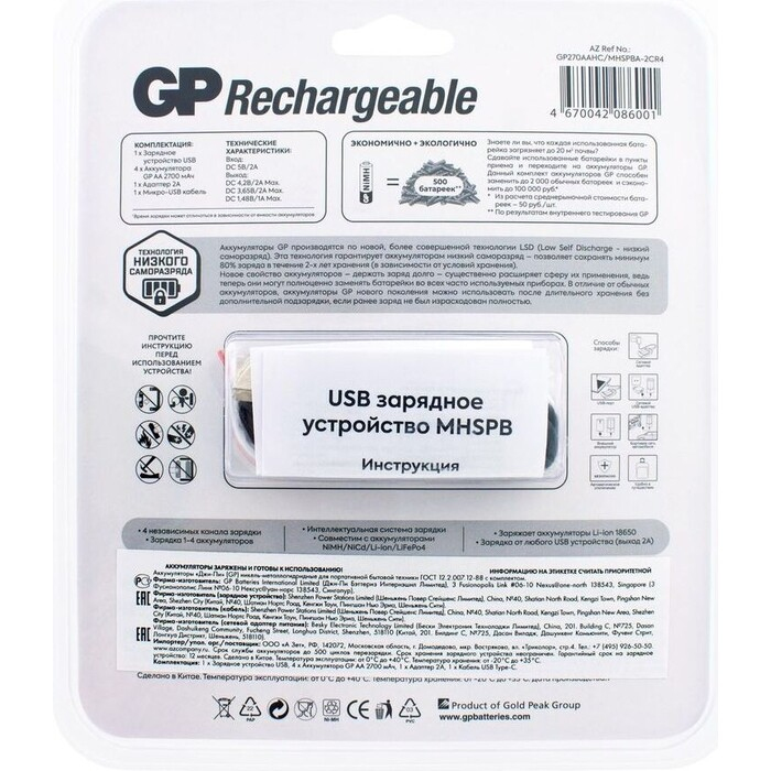 Зарядное устройство GP270AAHCMHSPBA-2CR4 предназначено для зарядки аккумуляторных батарей типов Ni-Mh/CD, Li-Ion и LiFePO большинства выпускаемых типоразмеров. Поставляется в комплекте с четырьмя перезаряжаемыми батарейками GP 2700 series Rechargeable типоразмера АА.
