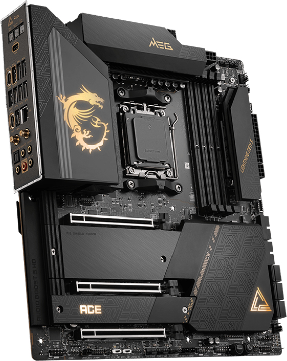 Плата MEG X670E ACE привлекает взгляд своим великолепным внешним видом с золотыми акцентами на черном фоне. Она представляет собой EATX-модель высочайшего уровня, способную раскрыть весь игровой потенциал платформы AMD X670, в том числе в режиме разгона.