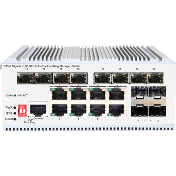 Managed L2 Industrial Fast Ring Switch 8x1000Base-T, 12x1000Base-X SFP, Surge 4KV, -40 to 75°C