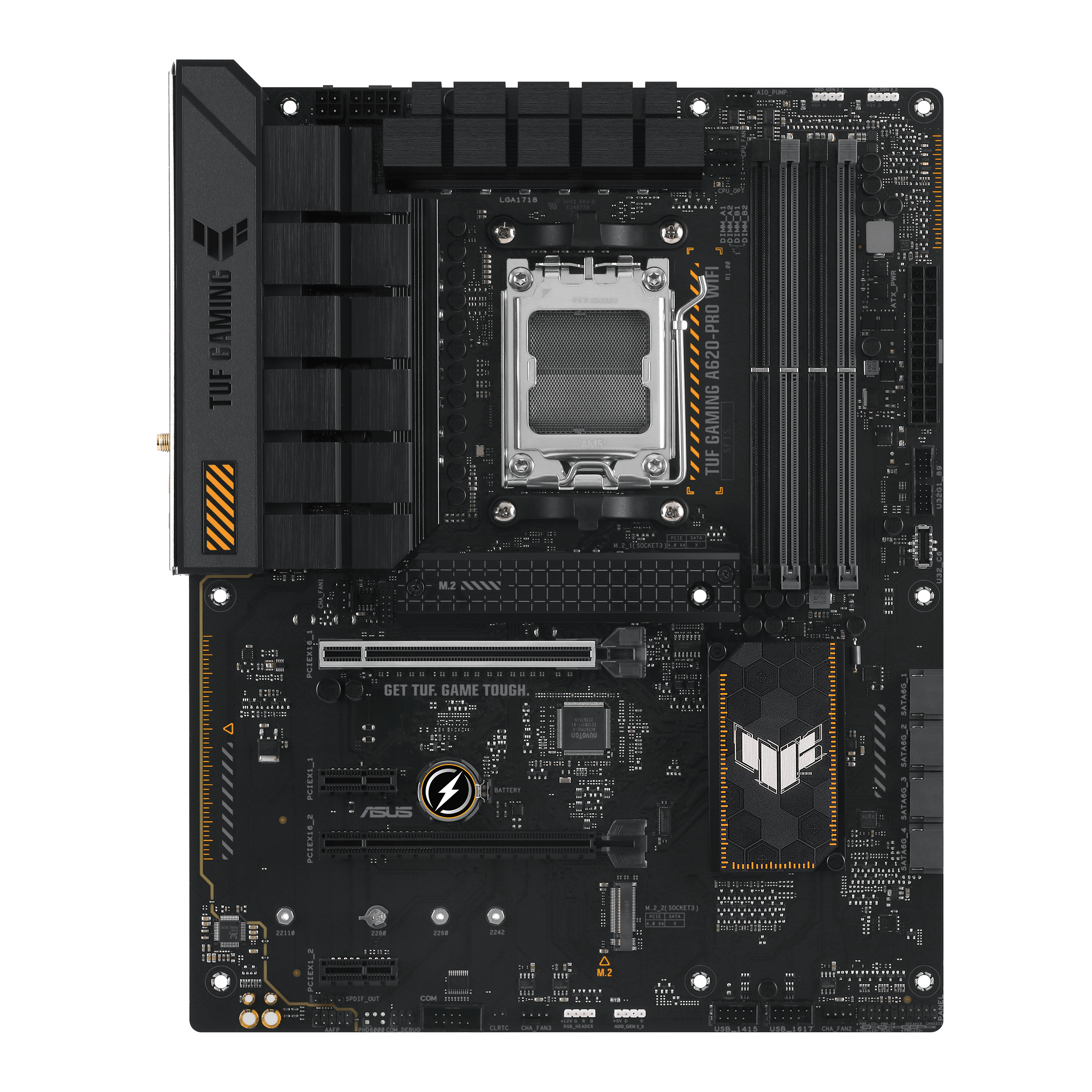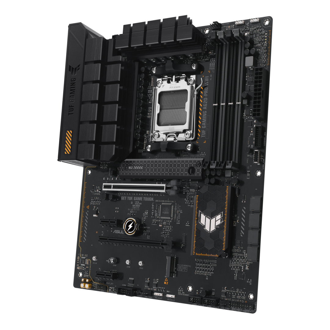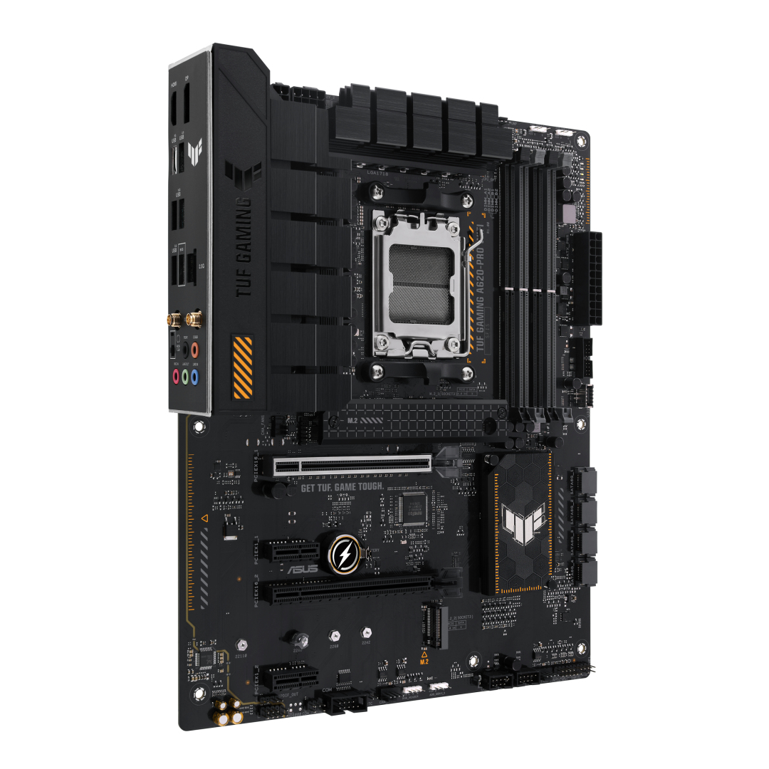TUF GAMING A620-PRO WIFI. ASUS TUF GAMING A620-PRO WIFI объединяет все основные элементы процессоров AMD Ryzen серии 7000 с игровыми функциями и проверенной надежностью. Эта материнская плата, разработанная с использованием компонентов военного класса, модернизированного решения по питанию и комплексной системы охлаждения, превосходит все ожидания благодаря надежной и стабильной производительности для марафонских игр. Материнские платы TUF GAMING также проходят строгие испытания на выносливость, чтобы убедиться, что они могут работать в условиях, в которых другие могут выйти из строя. С эстетической точки зрения эта модель сочетает в себе прочные черные и геометрические элементы дизайна, отражающие надежность и стабильность, характерные для серии TUF GAMING.