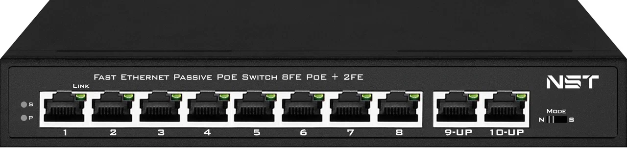 Passive PoE коммутатор Fast Ethernet на 10 портов. Порты: 8 х FE (10/100 Base-T, 52V 4,5(+) 7,8(–)) совместимы с PoE (IEEE 802.3af/at), 2 x FE (10/100 Base-T) Uplink. Совместим со стандартами PoE IEEE 802.3af/at. Мощность PoE на порт - до 30W. Поддержка р