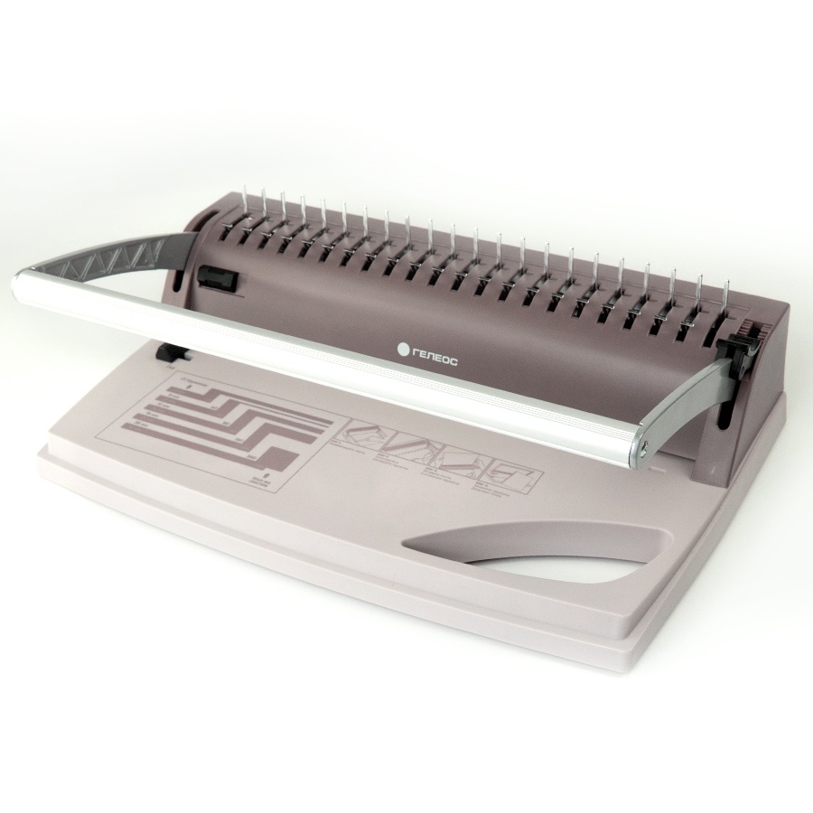 Базовый переплетчик на пластиковую пружину. Подходит для использования в малом офисе и дома. Дает возможность сделать практичный и экономичный переплет на пластиковую пружину диаметром до 19 мм, это блок объемом в 150 листов (80 г/м2). Такой вид переплета позволяет свободно пользоваться оформленным материалом: раскрывать документ на любой градус, копировать, заменять, добавлять и убирать листы. Преимущества: легкий, удобный при переносе, компактный. Лаконичный корпус, на станине для удобства работы имеется упор для бумаги, есть ручка для переноса, и удобная таблица для подбора пружины и пошаговая инструкция