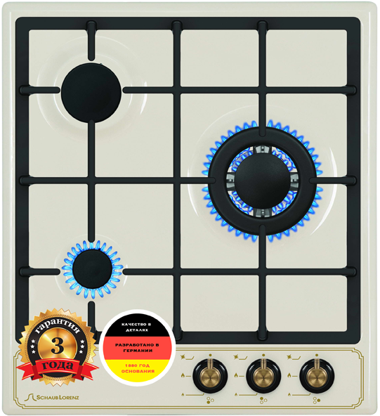 Газовая варочная поверхность SchaubLorenz GB4520 – это современная кухонная техника, выполненная в стиле Retro. Бежевый цвет панели и бронзовые элементы управления выгодно выделяют модель из всей линейки варочных поверхностей компании SchaubLorenz.Варочная поверхность имеет ширину 45 см. Узкая бытовая техника – идеальное решение для небольших кухонь. Данная модель имеет три конфорки, их достаточно для приготовления еды для семьи из четырех человек, т.к. одновременно используется только три конфорки. Благодаря независимой конструкции панель может быть размещена в любом месте независимо от расположения духового шкафа.Газовая варочная поверхность SchaubLorenz GB4520 оснащена тремя газовыми конфорками разного размера и мощности: одна экономичная малого диаметра, которая подходит для разогрева пищи, одна стандартная – оптимальное решение для приготовления еды, и одна WOK-конфорка, позволяющая готовить пищу в толстостенной посуде.В газовой варочной поверхности Schaub Lorenz GW4310 используется цельная эмалированная решетка, которая легче, чем чугунная, но не уступает ей ни в прочности, ни в устойчивости посуды.Управление моделью осуществляется с помощью механических переключателей, расположенных на фронтальной части панели. С их помощью Вы можете регулировать силу пламени. Поджиг конфорки происходит автоматически при повороте регулятора конфорки.Функция газ контроля обеспечивает безопасность Вашего дома. Если по какой-то внешней причине пламя горелки погаснет, подача газа сразу прекратится.