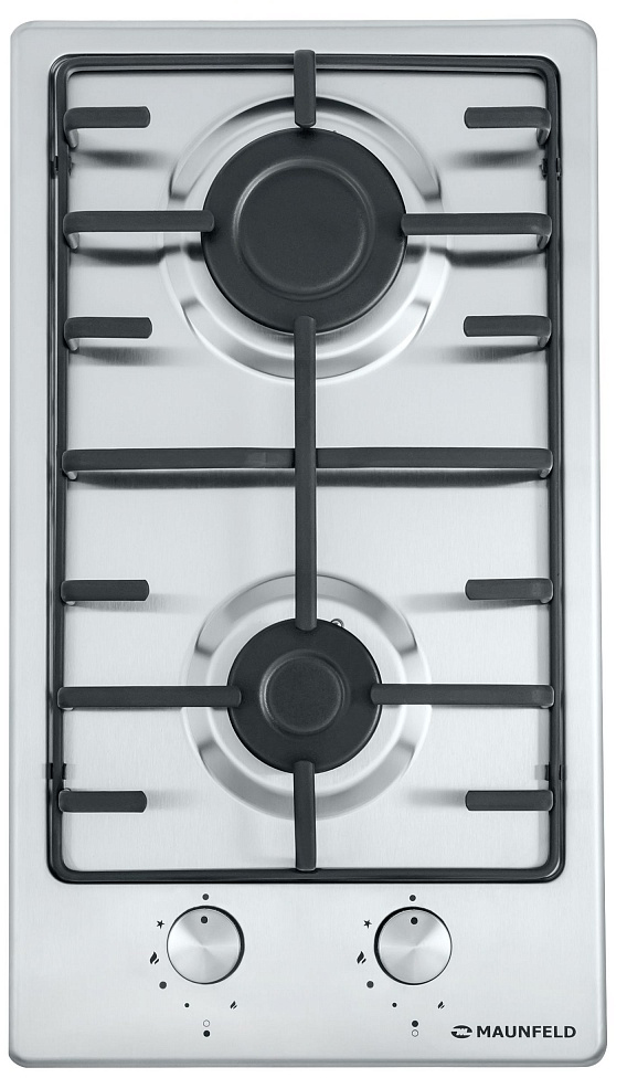 Газовая варочная панель, поверхность из нержавеющей стали, 2 газовые конфорки, переключатели поворотные, электроподжиг, независимая установка, габариты (ШхГ) 29x51.5 см