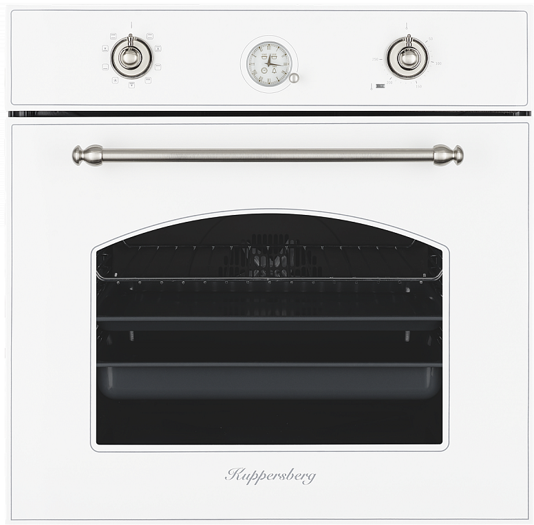 Электрический независимый духовой шкаф, Multifunction, 9 режимов, аналоговый таймер, поворотные переключатели, макси-гриль, турбо режим, гидролизная очистка, каталитическая задняя стенка, объем 57 литров, цвет белый жемчуг/ручка дверцы и переключатели цвета серебро