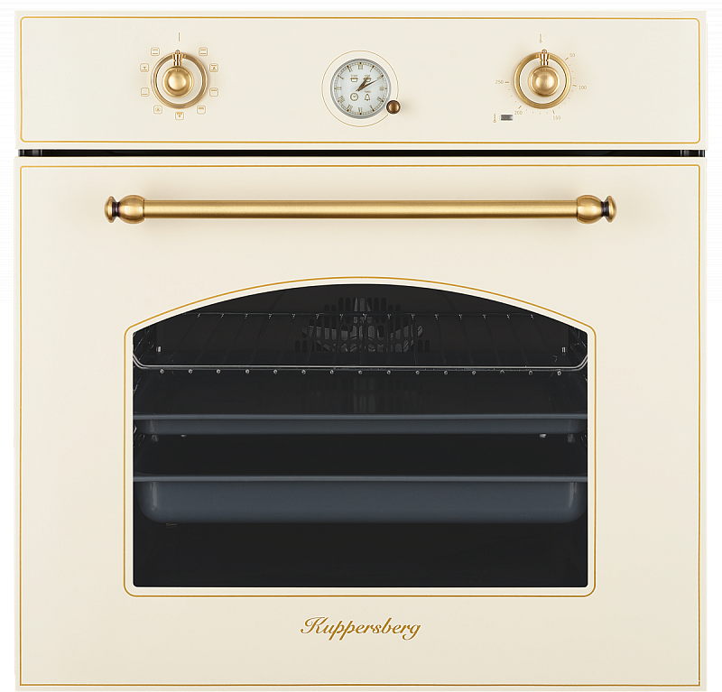 Электрический независимый духовой шкаф, 9 режимов(Турбо режим, Традиционный нагрев с конвекцией, Нижний нагрев с конвекцией, Нижний нагрев с грилем, Макси-гриль с конвекцией, Нижний нагрев, Традиционный нагрев, Макси-гриль, Гриль) аналоговый таймер, поворотные переключатели, каталитическая и гидролизная системы очистки, легкоочищающаяся эмаль Crystal Clean, 2-х уровневые телескопические направляющие, объем 57 литров, цвет бежевый(эмаль) /ручка дверцы и переключатели цвета бронзы