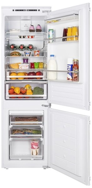 Холодильник встраиваемый MAUNFELD/ Тип: двухкамерный с статической системой в холодильном отделении и с системой NoFrost в морозильном отделении.Тип установки: встраиваемый. Общий/полезный объем, л: 251/246. Управление: Электронное. Класс энергопотребления: A+. Тип хладогента: R600A. Климатический класс: N-ST. Перенавешиваемые двери. Антибактериальный пластик легкой очистки. Энергопотребление кВт.ч/год: 284. Уровень шума, Дб: 41