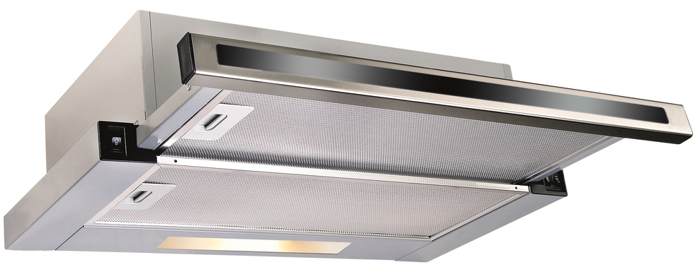 Встраиваемый монтаж с выдвижным экраномВытяжка данного типа монтируются в кухонный шкаф. Имеют выдвижную панель, которая увеличивает площадь забора воздуха и облегчает управление вытяжкой.