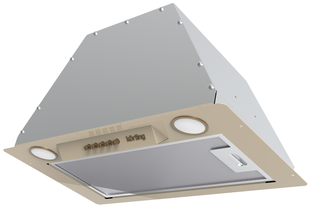 Вытяжки Korting/ Полностью встраиваемая, в шкаф 60см, механическое управление, 3 режима, 650 м3/ч., алюминиевый жировой фильтр, LED лампы освещения, цвет - слоновая кость, кнопки и ободки ламп освещения - бронза