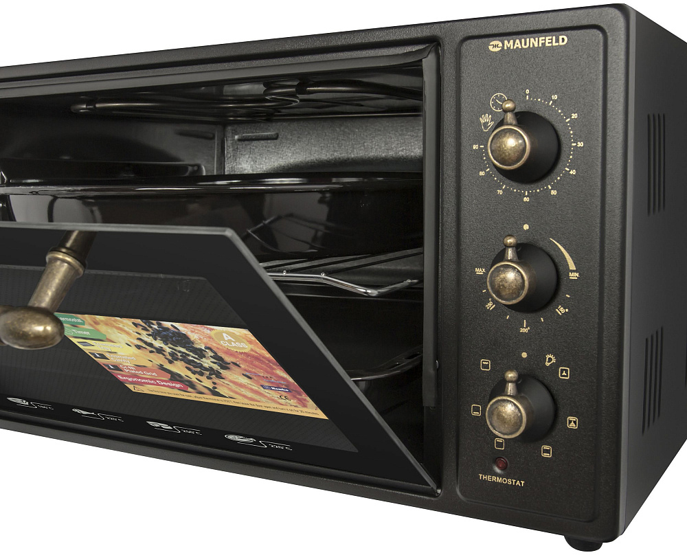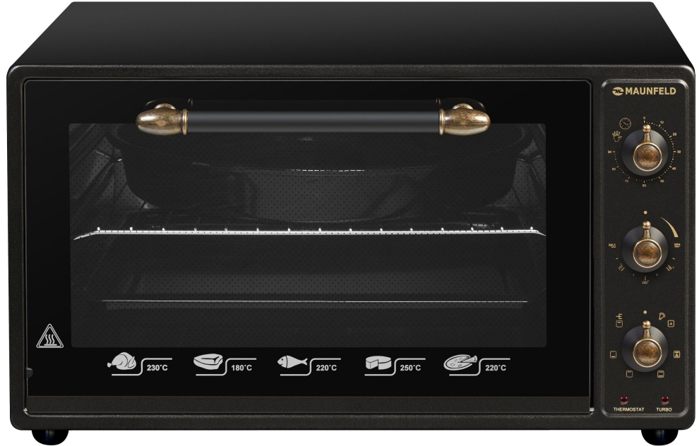 Мини-печь MAUNFELD/ ширина 60 см, механическое управление, 45 л,конвекция, черный+стекло,фурнитура бронза