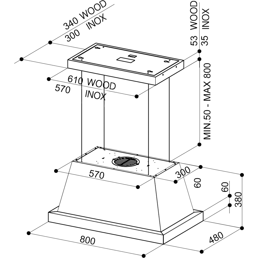 Задача островной вытяжки не только очистка воздуха, но и украшение кухни. Если вы хотите оригинально оформить рабочую зону, выбирайте подвесную модель из серии THEA. Прибор крепится к потолку, может работать в режимах отвода и рециркуляции, укомплектован жироулавливающим фильтром. Благодаря мотору Evo и технологии двойного захвата воздуха островная вытяжка показывает довольно высокую производительность до 750 м3/час. Ширина устройства равна 80 см можно устанавливать над крупногабаритными варочными панелями. Чтобы труба воздуховода не нарушала интерьер кухни, можно использовать режим рециркуляции. В этом случае вам потребуется установить на вытяжное устройство угольный фильтр, который можно приобрести отдельно. В приборе предусмотрено кнопочное управление. Но для удобства эксплуатации есть возможность применять дистанционный пульт (не входит в комплект). Четыре варианта скоростных режимов позволяют рационально использовать мощность мотора вытяжки. Один из них является интенсивным и задействует ресурсы двигателя на пределе возможностей, благодаря чему даже сильнозагрязненный воздух очищается очень быстро. Максимальное время работы опции 6 минут, после чего происходит автоматическое переключение на стандартную скорость. Вытяжное устройство оснащается двумя светодиодными лампами, которые дают мягкий дневной свет (цветовая температура 4000 К) и потребляют всего 3 Вт электроэнергии.