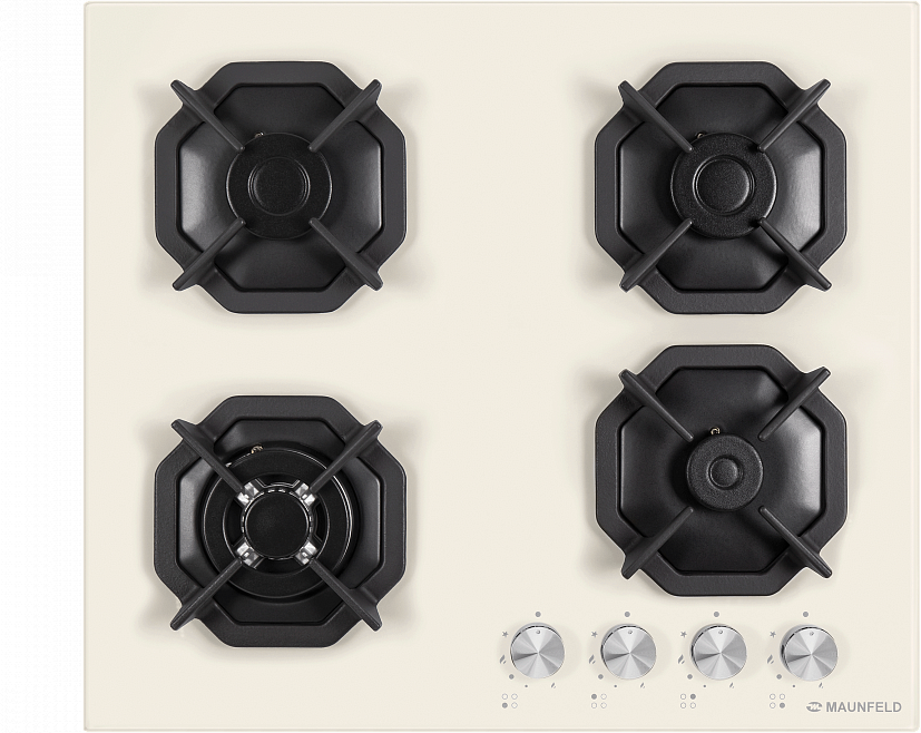Встраиваемые газовые панели MAUNFELD/ газ, газ на стекле, ширина 60 см, 4 конфорки, чугунные решетки, газ-контроль , электроподжиг, бежевый