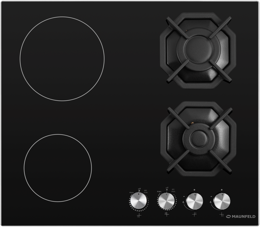 Стильная встраиваемая комбинированная варочная панель выполнена из закаленного стекла толщиной 8 мм. Две газовые высококачественные итальянские горелки SABAF с дизайнерскими восьмиугольными чугунными решетками и две керамические электрические конфорки.