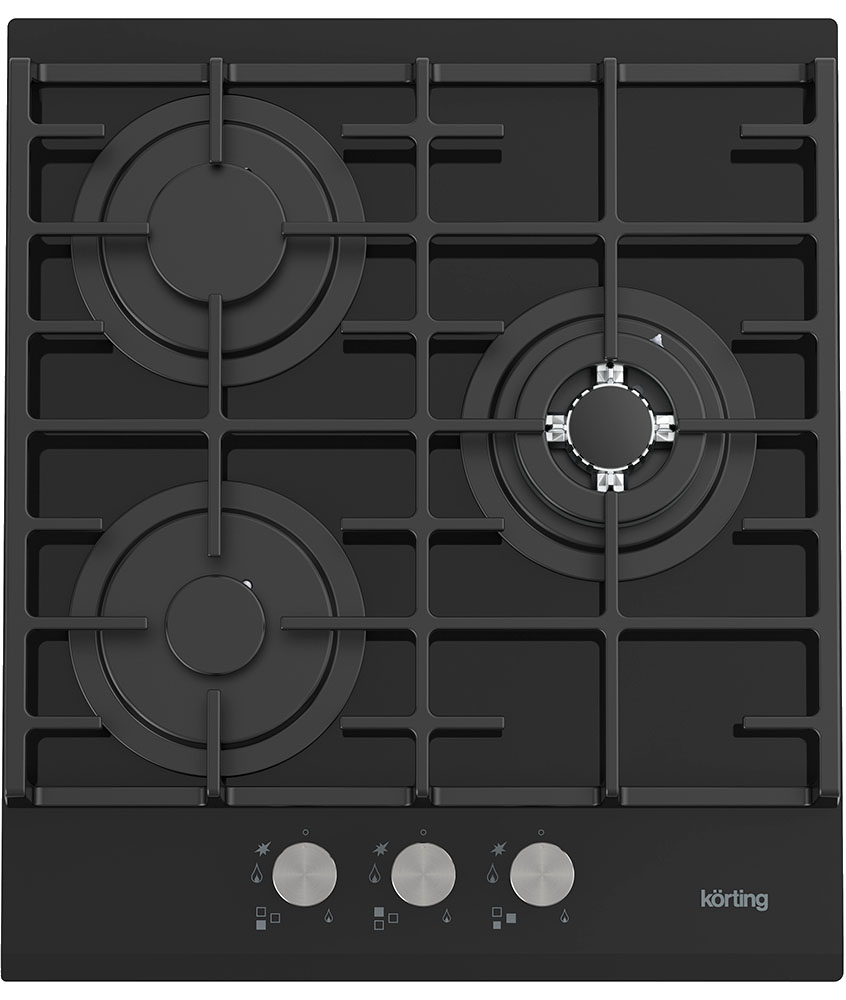 Встраиваемая газовая панель Korting/ Газовая варочная панель из закаленного стекла, ширина 45 см, 3 высокоэффективные конфорки, сверхмощная конфорка WOK, автоматический электроподжиг, газ-контроль каждой конфорки, передние металлические переключатели, чугунная решетка для посуды, в комплекте - Чугунная подставка WOK, адаптер для кофейника, скошенный передний край, цвет - черный