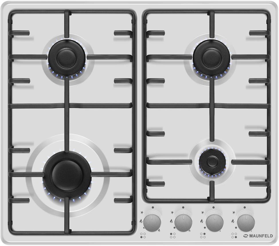 Классическая встраиваемая газовая варочная панель шириной 60 см может работать от магистрального газа и газа в баллоне (тип G30), для этого достаточно поставить специальные жиклеры, поставляющиеся в комплекте.Панель выполнена из металла, покрытого термостойкой прочной эмалью белого цвета. Четыре стандартные конфорки мощностью 1000 Вт, 1700 Вт, 1700 Вт и 2600 Вт. Конфорки спроектированы таким образом, что огонь не перегревает ни эмалированные решетки, ни ручки управления. Регулирование подачи газа и электроподжиг конфорок происходит с помощью поворотных ручек из термостойкой пластмассы. Для простоты использования около каждой ручки нанесены информационные изображения: используемая конфорка, подача газа выключена, электроподжиг, максимальное пламя и минимальное пламя.Система газ-контроля надежно защищает бытовой прибор от утечек газа при неожиданном затухании конфорки.