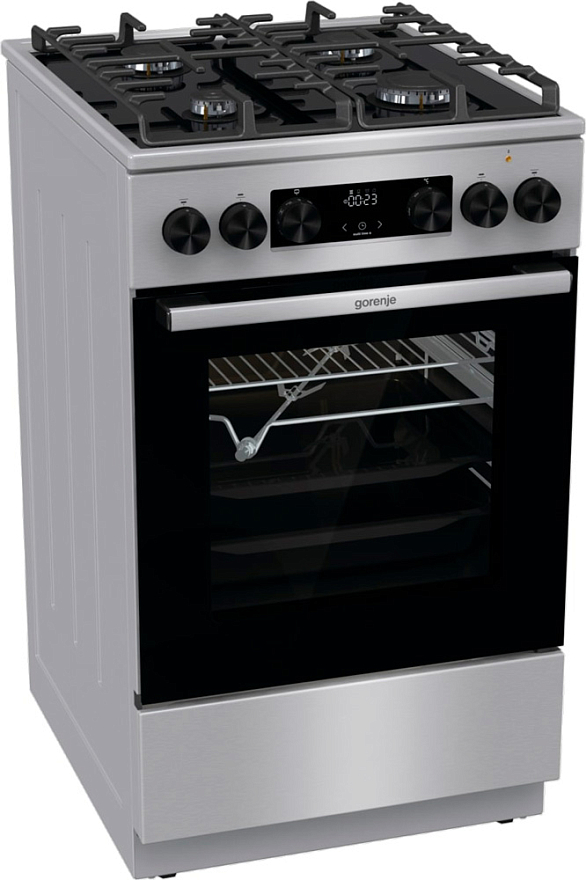 Комбинированная плита Gorenje GK5C65XV выполнена в сочетании серого и чёрного. Особенно стильно смотрятся чугунные решётки ProGrid. Они сконструированы таким образом, что посуду можно перемещать по ним, как по полозьям, не поднимая с конфорки на конфорку. Чтобы выставить необходимые параметры, на панели управления имеются поворотные регуляторы и сенсорный программатор IconLED. На нём расположены переключатели режимов и температуры духовки, а также настройки таймера. Он функционирует как на звуковое оповещение, так и на автоматическое отключение по истечении времени.