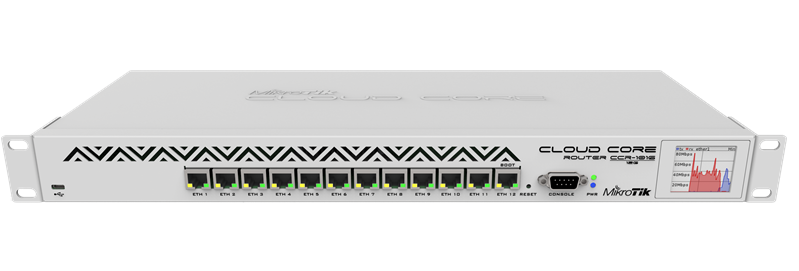 MikroTik Cloud Core Router 1016-12G with Tilera Tile-Gx16 CPU (16-cores, 1.2Ghz per core), 2GB RAM, 12xGbit LAN, RouterOS L6, 1U rackmount case, Dual PSU, LCD panel, r2 version