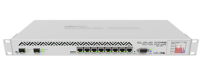 MikroTik Cloud Core Router 1036-8G-2S+ with Tilera Tile-Gx36 CPU (36-cores, 1.2Ghz per core), 4GB RAM, 2xSFP+ cage, 8xGbit LAN, RouterOS L6, 1U rackmount case, Dual PSU, LCD panel, r2 version
