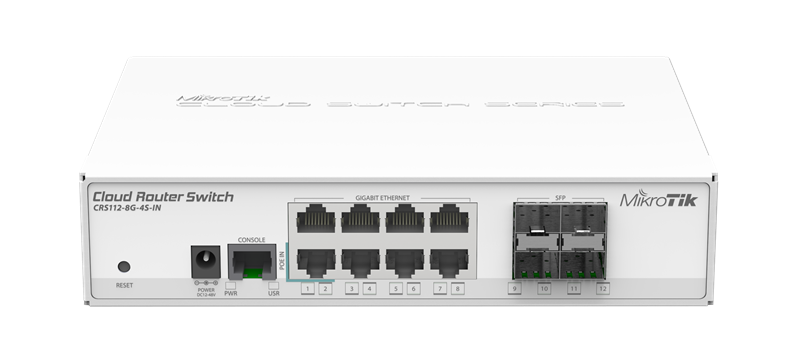 MikroTik Cloud Router Switch 112-8G-4S-IN with QCA8511 400Mhz CPU, 128MB RAM, 8xGigabit LAN, 4xSFP, RouterOS L5, desktop case, PSU