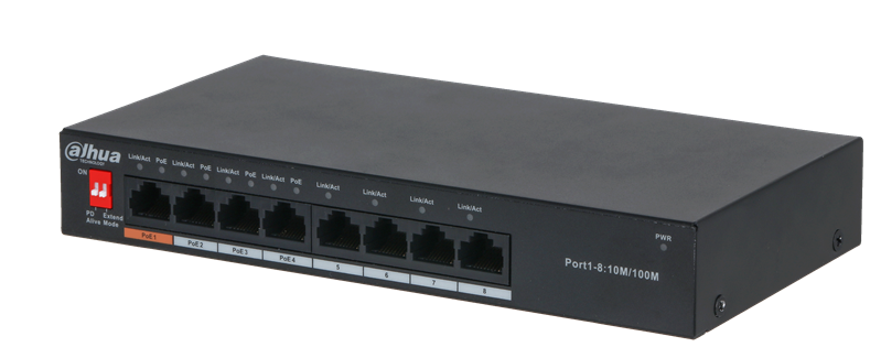 DAHUA 8-портовый неуправляемый коммутатор с РоЕПорты: 4 RJ45 10/100/100Мбит/с (PoE/PoE+/Hi-PoE), 4 RJ45 10/100/100Мбит/с (uplink); мощность PoE: порт 1 до 60Вт, порты 2~4 до 30Вт, суммарно до 60Вт; P