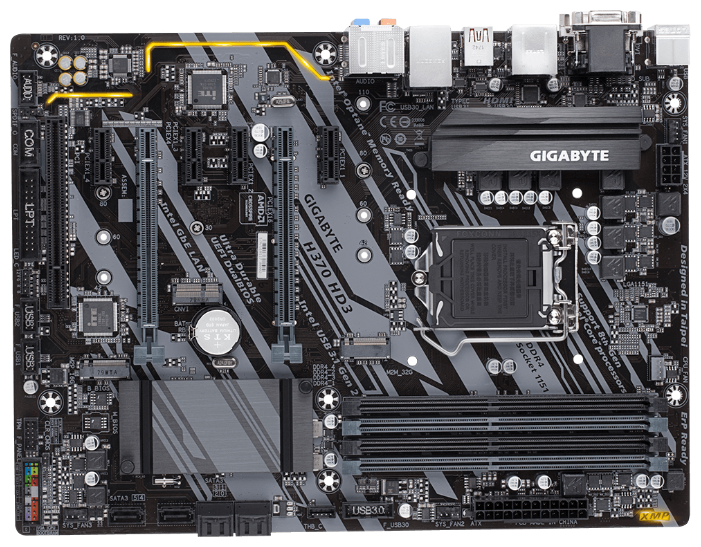 Gigabyte H370 HD3 Socket 1151, Intel®H370, 4xDDR4-2666, D-SUB+DVI-D+HDMI, 2xPCI-Ex16, 4xPCI-Ex1, 1xPCI, 6xSATA3(RAID 0/1/5/10), 2xM.2, 8 Ch Audio, GLan, (2+4)xUSB2.0, (5+2)xUSB3.1, 1xUSB3.1 Type-C™, 1