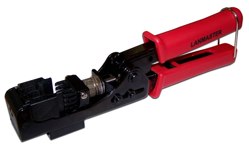 Обжимной инструмент для кейстоунов LAN-OK45Uхх/90. Обжимные клещи позволяют производить процесс терминации и обрезки излишней длины проводников на всех 8 контактах одновременно на всех 8 контактах модуля, за одну операцию. Процесс терминации осуществляется строго перпендикулярно к поверхности ножей, без перекосов и с одинаковым усилием для всех контактов, что повышает качество монтажа, уменьшает время операции и снижает риск получения монтажником травм при использовании ударного инструмента.