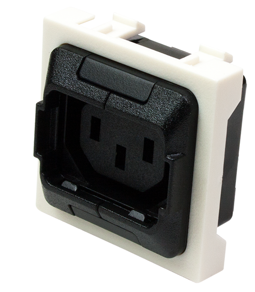 Гнездо IEC 60320 C13 с блокировкой, 10A, 250V, формата Mosaic, 45x45 мм. Вставка с блокировкой позволяет исключить произвольное извлечение разъема. Модуль имеет размер 45х45 мм под французский стандарт Mosaic и может применяться для комплектации розеток, а также рабочих мест в миниколоннах, напольных лючках и настенных боксах. Коммутируемое напряжение – 250 В, 50 Гц. Ток – 10 А.
