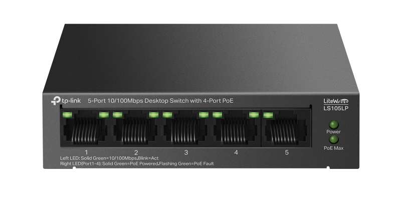 Сетевое оборудование TP-Link LS105LP, Настольный коммутатор с 5 портами 10/100 Мбит/с (4 порта PoE), 802.3af, бюджет PoE — 41 Вт, до 250 метров