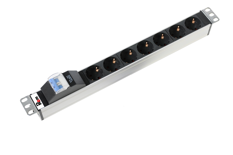 Блок розеток Rem-16 с авт. 16 А, 7 Schuko, алюм., 19", колодка. Блок силовых розеток имеет семь портов стандарта Schuko, выполнен в анодированном алюминиевом корпусе. Розетки расположены под углом 45%, для удобного подсоединения коленчатых штекеров. Блок имеет автомат защиты 16А. Для подключения питания предусмотрена клеммная колодка для кабеля номинальным сечением до 2,5 м2
