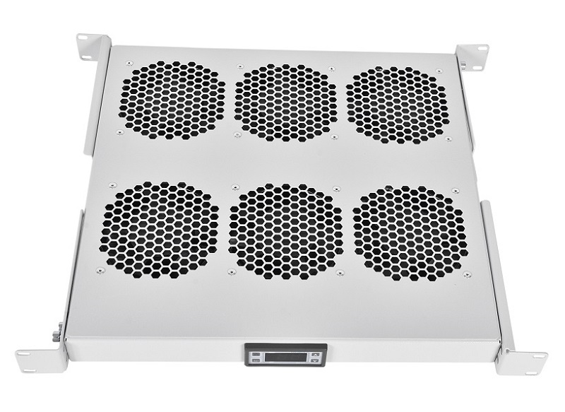 Модуль вентиляторный 19" 1U, 6 вентиляторов, регул. глубина 390-750 мм с контроллером. Модуль имеет встроенный контроллер температуры, позволяет настроить включение и выключение вентилятора при заданной температуре