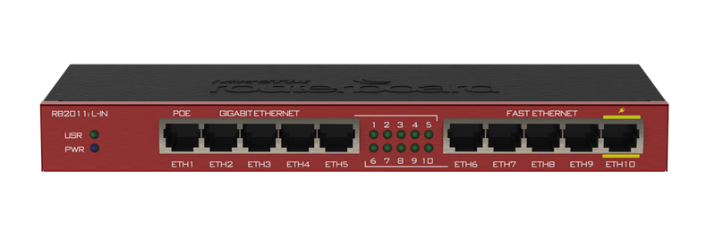 MikroTik RouterBOARD 2011iL with Atheros 74K MIPS CPU, 64MB RAM, 5xLAN, 5XGbit LAN, RouterOS L4, desktop case, PSU