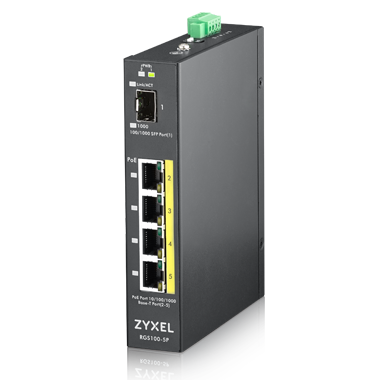 Промышленный PoE+ коммутатор Zyxel RGS100-5P, 4xGE PoE+, 1xSFP, крепление на стену/DIN-рейку, IP30, два источника питания DC, бюджет PoE 120 Вт