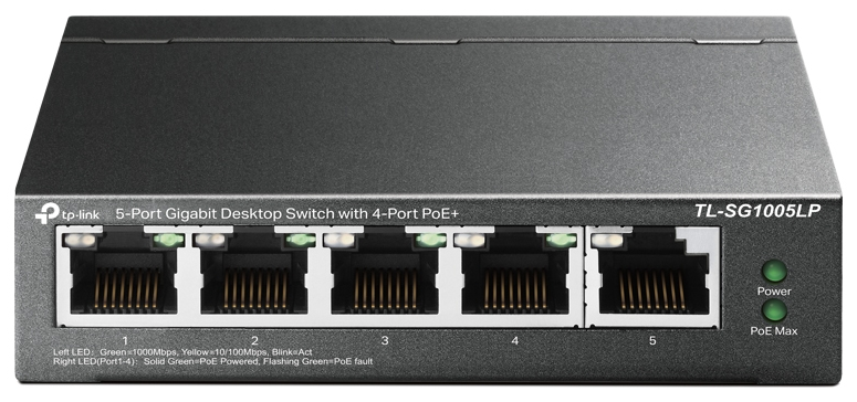 TP-Link 5-портовый гигабитный неуправляемый коммутатор с 4 портами PoE+, металлический корпус, настольная установка, бюджет PoE — 40 Вт.