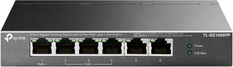 Сетевое оборудование TP-Link TL-SG1006PP, Настольный коммутатор с 6 гигабитными портами (3 порта PoE+, 1 порт PoE++), 802.3af/at/bt 3-го типа, бюджет PoE — 64 Вт, стальной настольный корпус